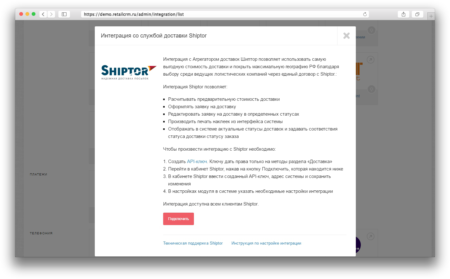 Далее необходимо перейти в личный кабинет Shiptor, нажав на кнопку «Подключить» во всплывающем окне подключения доставки в системе.