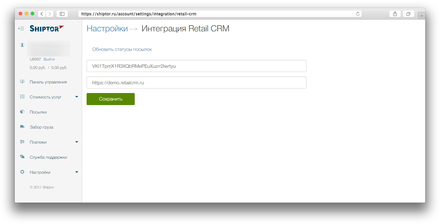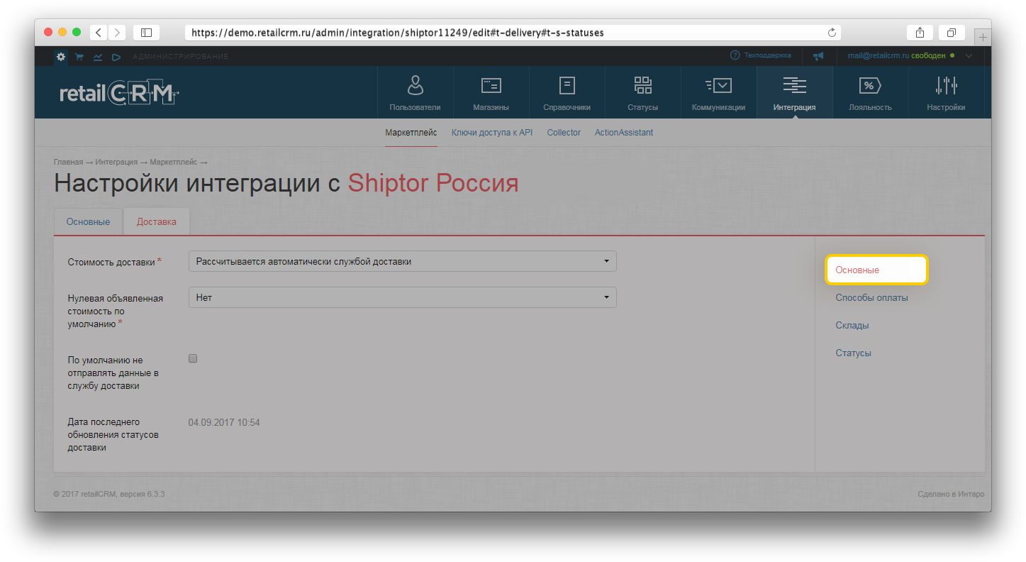 После сохранения активируется модуль интеграции с доставкой Shiptor.