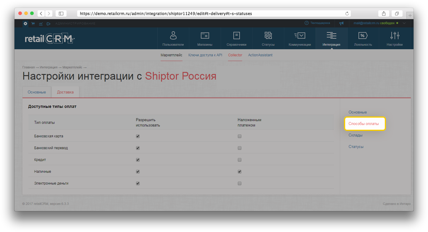 На второй вкладке простая настройка доступных способов оплаты для типа доставки Shiptor.