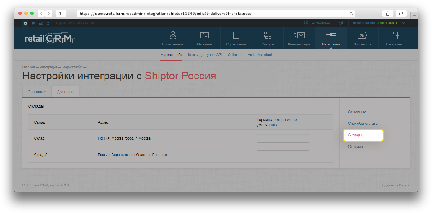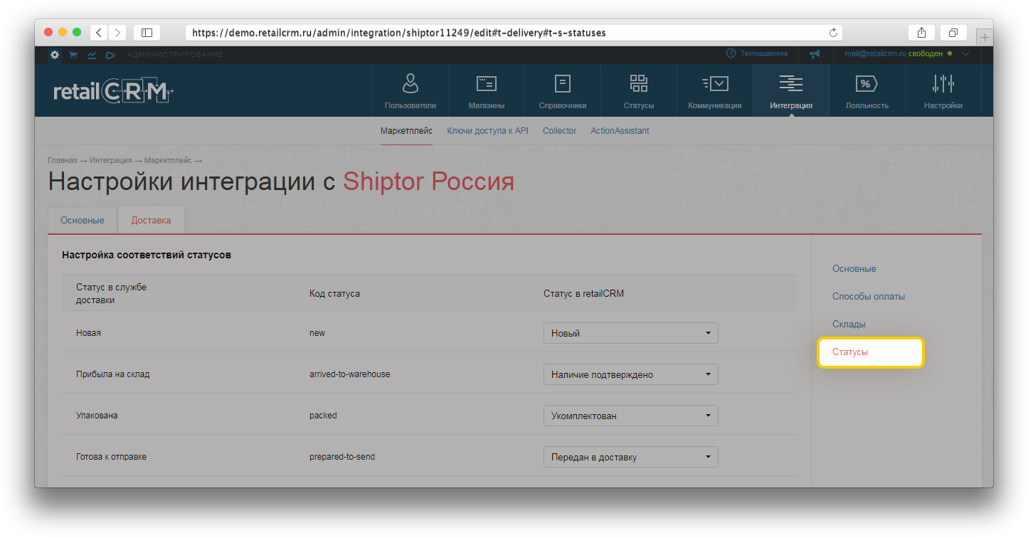 В этой вкладке можно настроить соответствие статусов Shiptor и системы.