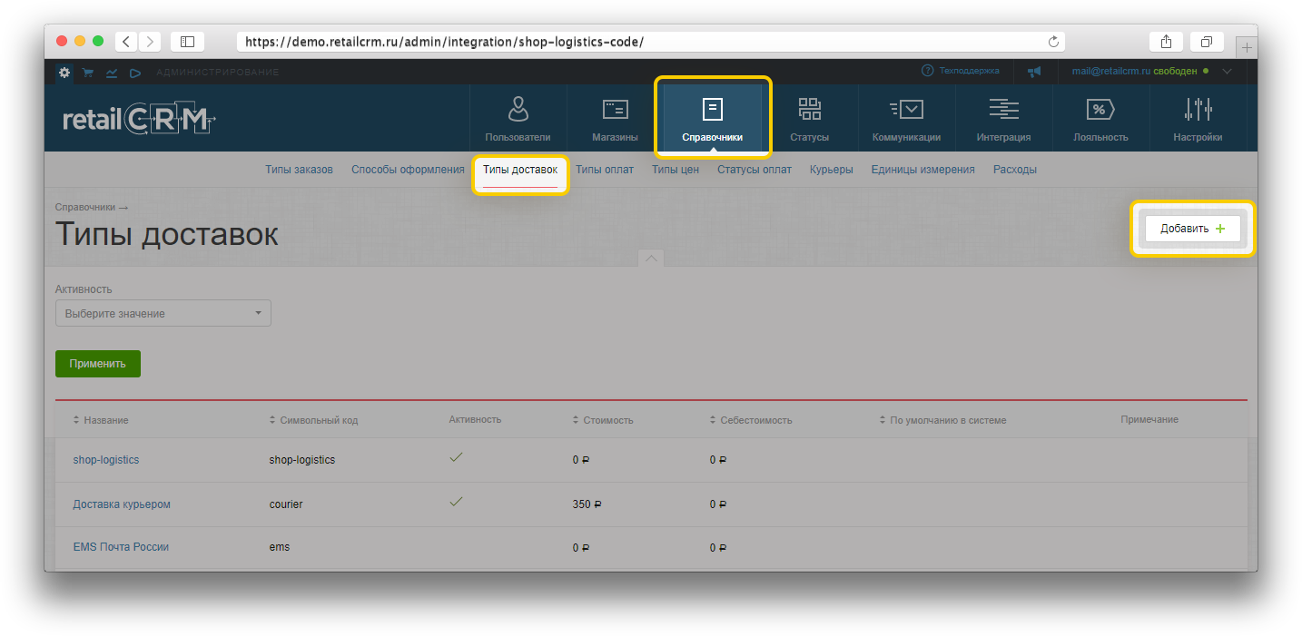 Для того, чтобы в заказе можно было пользоваться службами доставки от Shiptor, надо сначала создать тип доставки. Зайдите в раздел Администрирование > Справочники > Типы доставок и нажмите на кнопку «Добавить».
