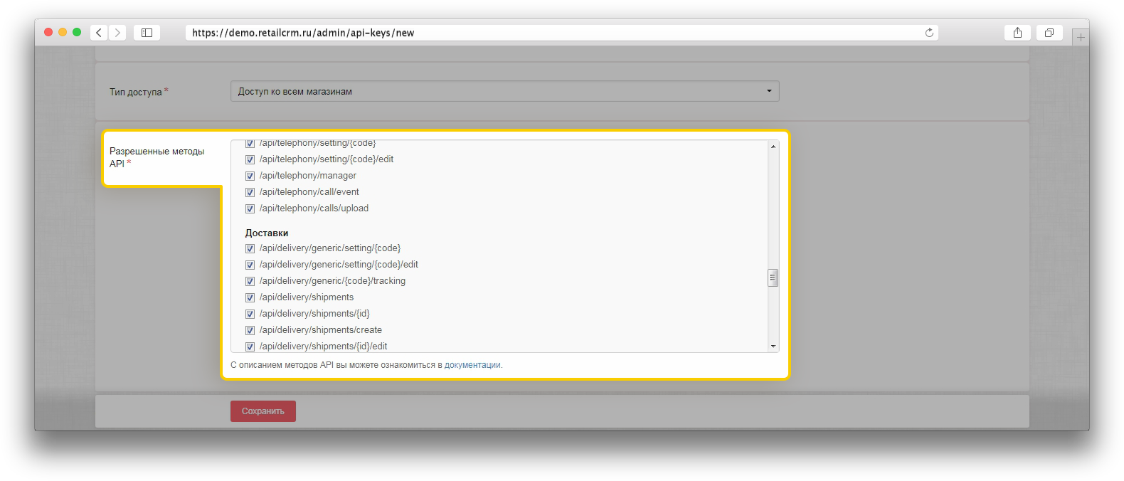Примечание: в создаваемом API-ключе, в поле «Разрешенные методы API», должны быть активированы методы «Доставки» и «Интеграция».