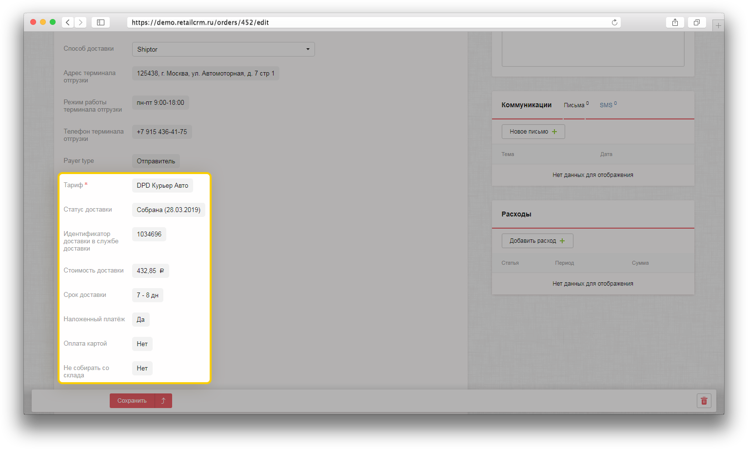 После выбора службы доставки, сразу сохранится вся информация о внесенных ранее данных и подставится стоимость срок доставки. Стоимость доставки для покупателя – отдельное редактируемое поле, зависит от настройки «Стоимость доставки устанавливает магазин». По службе доставки появится подробная информация по адресу и времени доставки.