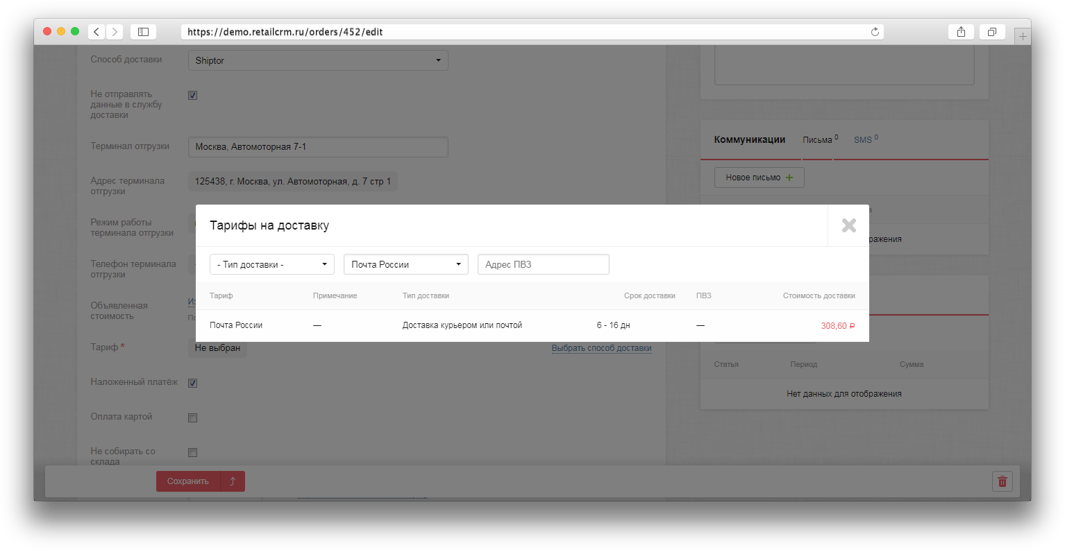 Интеграция с агрегатором доставок «Shiptor» позволяет использовать самую выгодную стоимость доставки и покрыть максимальную географию РФ благодаря выбору среди ведущих логистических компаний через единый договор с Shiptor.
