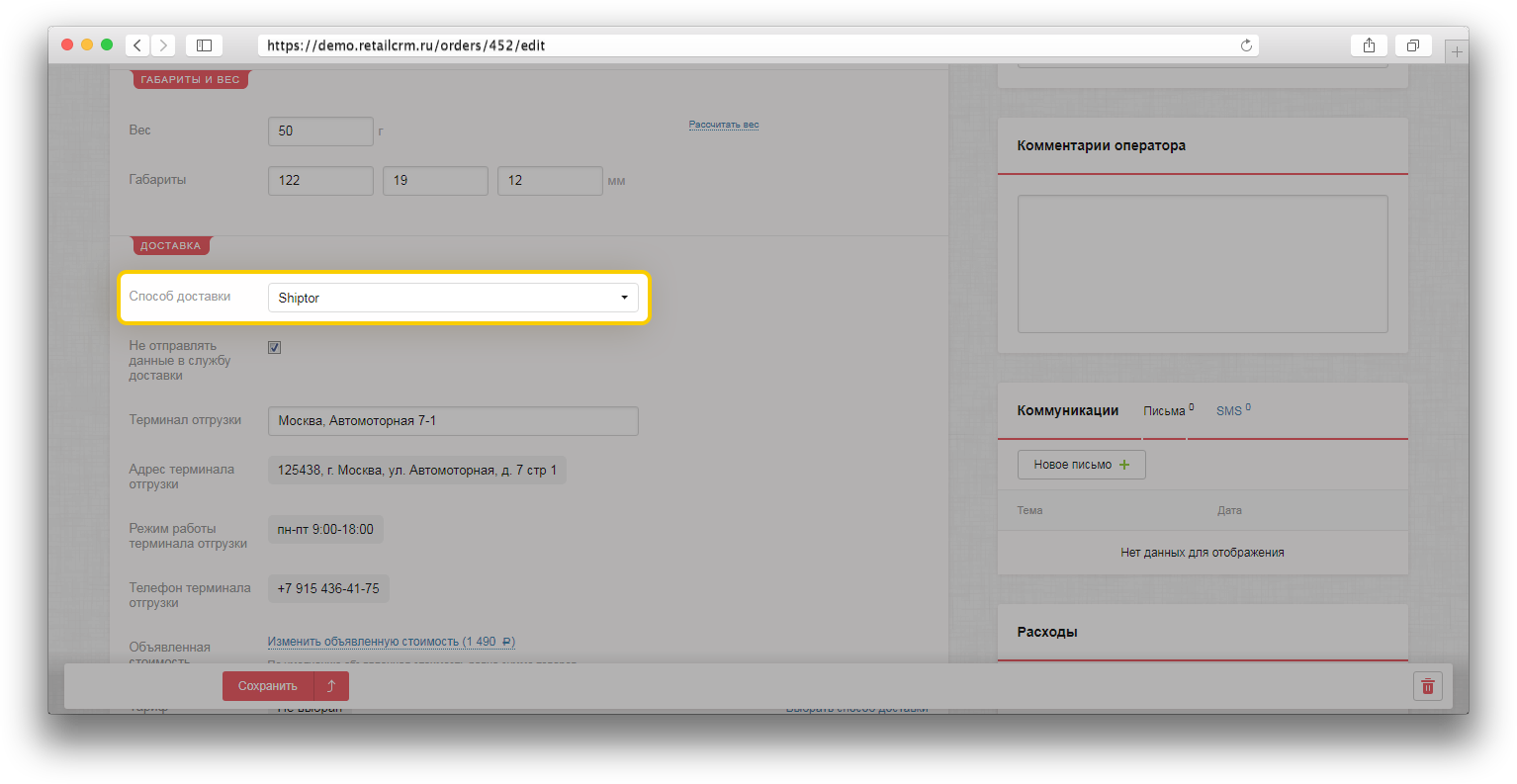 Рассмотрим заказ, в котором выбран тип доставки Shiptor. Габариты можно установить по умолчанию в основных настройках системы в разделе Администрирование > Настройки > Основные.