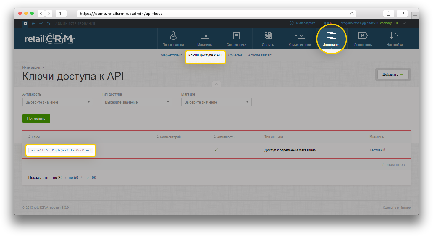 Для начала интеграции Вам необходимо в системе перейти по пути Администрирование > Интеграция > Ключи доступа к API и создать API-ключ.