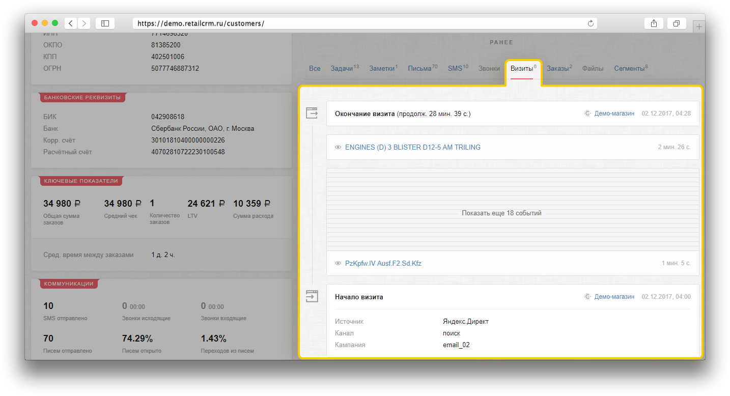 Если кликнуть по надписи «Показать еще N событий», откроется список с подробной информацией о списке страниц, которые пользователь посетил в рамках одного визита. Также отображается начало и конец визита.