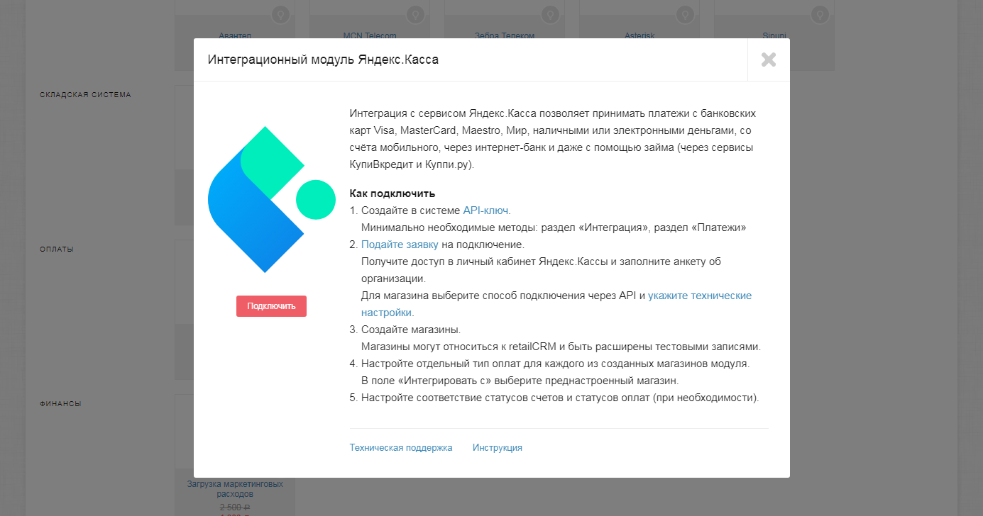 Важно! В Яндекс.Кассе у Вас должен быть подключен магазин, поддерживающий способ подключения через API.