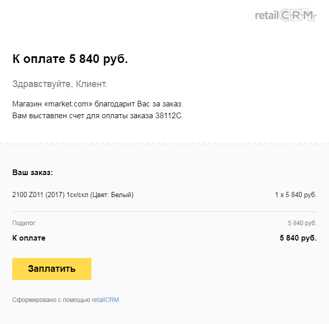 Интеграция с Яндекс.Кассой позволяет выписывать клиенту счет на оплату прямо из карточки заказа. Счет можно отправлять письмом, по SMS или сформировать ссылку на оплату и отправить клиенту любым удобным способом.