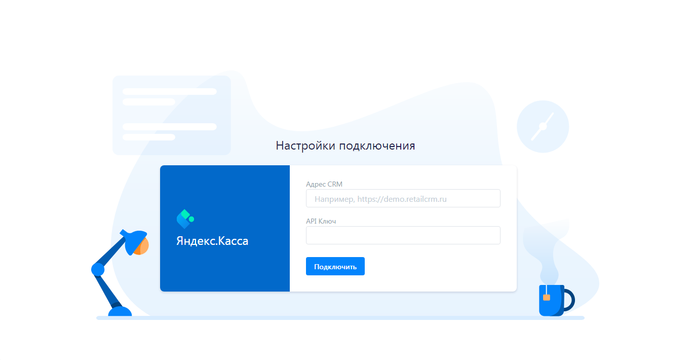 После нажатия на кнопку «Подключить» произойдет перенаправление на страницу подключения, где необходимо указать созданный ранее API-ключ. Адрес Вашей системы подставится автоматически в соответствующее поле.