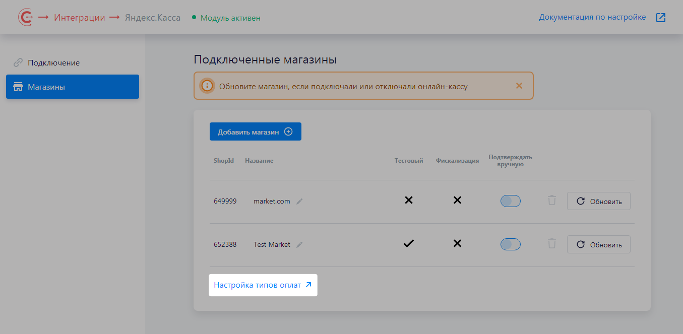 Обратите внимание, что для каждого подключенного магазина необходимо создавать отдельный тип оплаты.
