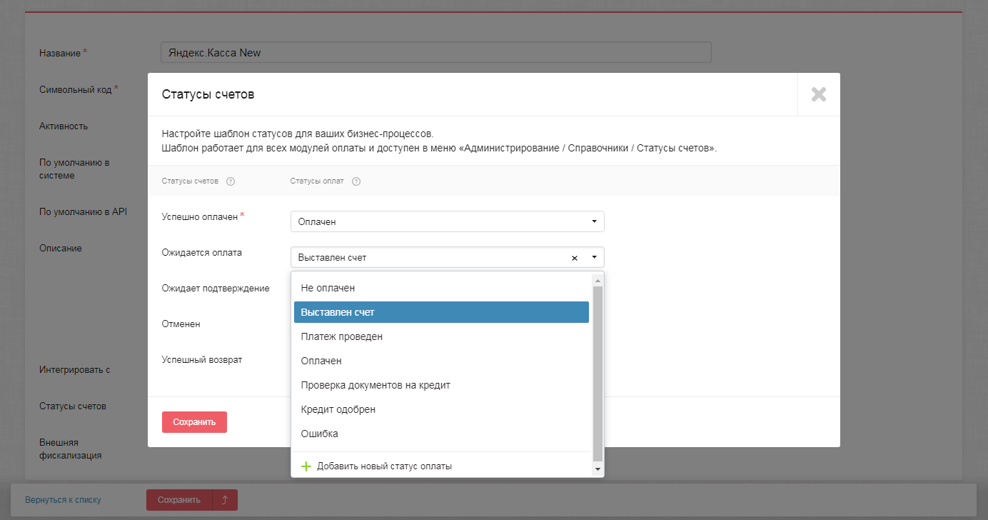 При подключении последующих модулей платежных систем будет задействовано уже настроенное соответствие статусов счетов. В случае необходимости маппинг статусов можно отредактировать.